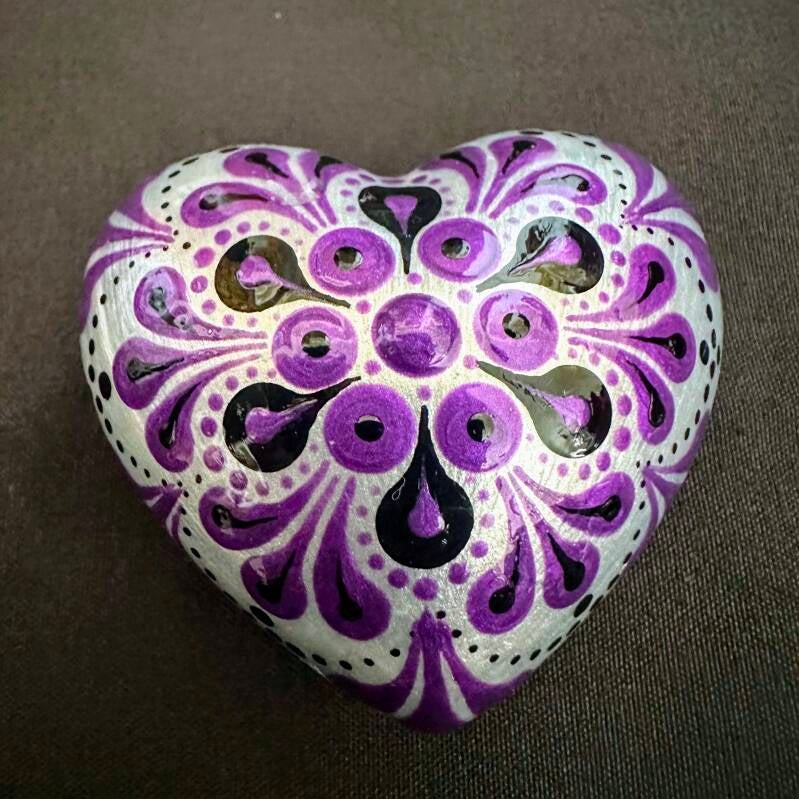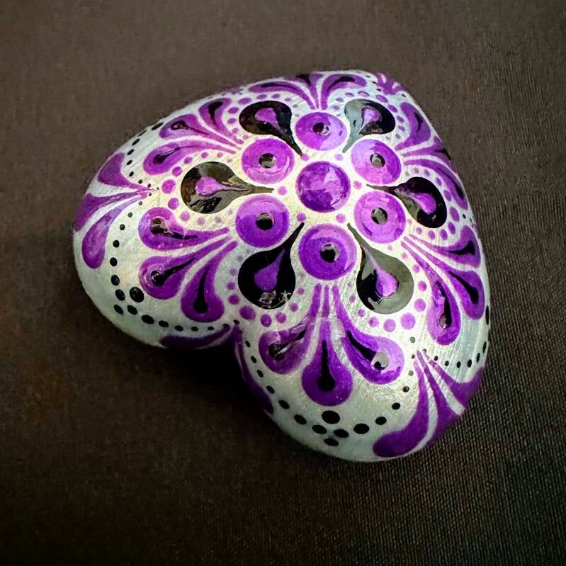 Pierre de réconfort. Mini cœur 5x5 cm violet et noir sur fond argenté
